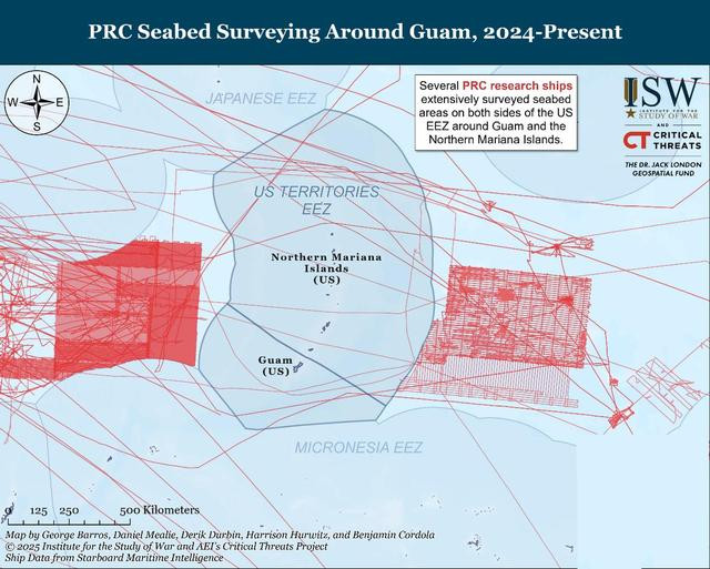 美国智库“战争研究所”和“美国企业研究所”共同发布的一份报告指出,从2023年开始中国的海洋科考船在西太平洋的活动频率大增,报告称最近两年中国的海洋科考船在台海、关岛附近海域常态化巡航,根据美国智库发布的中国科考船在关岛附近海域的航行轨迹图来看,简直就像在关岛附近“犁地”,关岛附近全部是红色的中国科考船航行轨迹,从这个示意图来看,中国科考船可谓是把关岛附近海域给转遍了!
